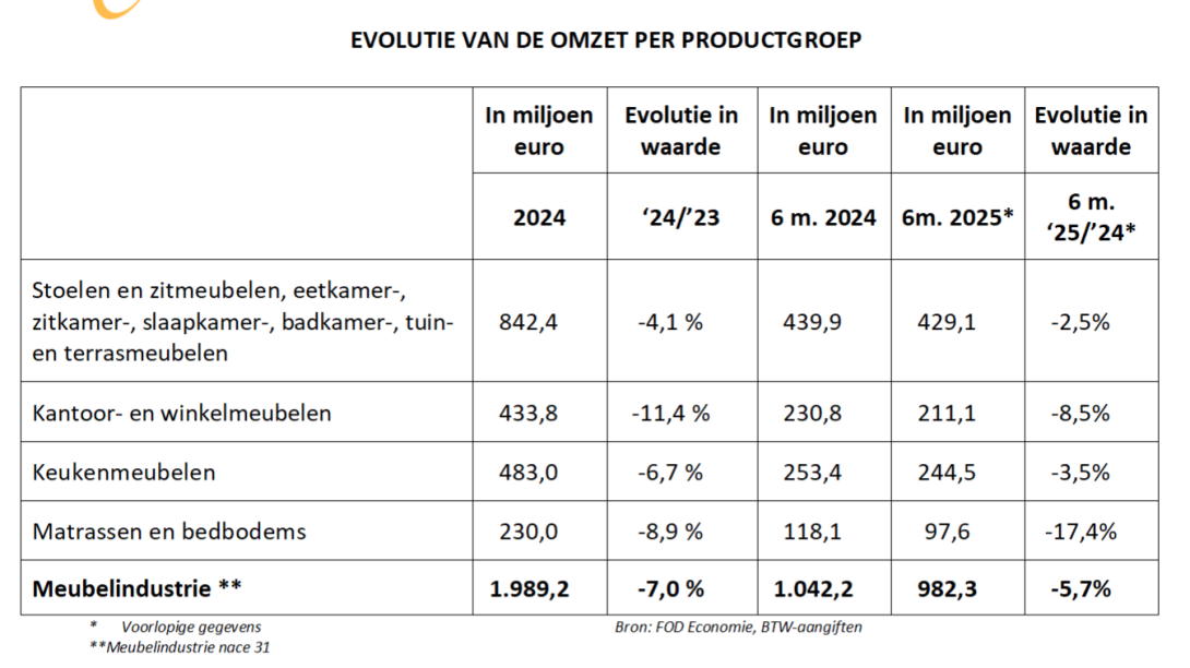 Au premier semestre 2025, le chiffre d’affaires a de nouveau reculé, cette fois de 5,7 %, pour atteindre 982 millions d’euros. La situation reste donc fragile, malgré quelques signes timides de stabilisation. Aucune catégorie de produits n’a connu de croissance : le mobilier de bureau et de magasin a perdu 8,5 %, les matelas et sommiers 17,4 %. Le mobilier de maison et les meubles de cuisine ont diminué plus modérément, respectivement de 2,5 % et 3,5 %. L’indice de production a enregistré un recul de volume de 2,1 % par rapport à la même période en 2024.